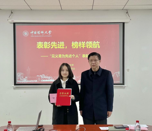 张语轩同学代表受表彰同学发表获奖感言。她对学校给予的特殊荣誉表达由衷感谢,并表示在他人危急时刻及时伸出援手是每一位青年员工应尽的责任。此次所获荣誉不仅是对她个人的肯定,也是对广大中国药大学子的鼓励。未来她将继续发扬这种精神,尽自己所能帮助他人,传递正能量。