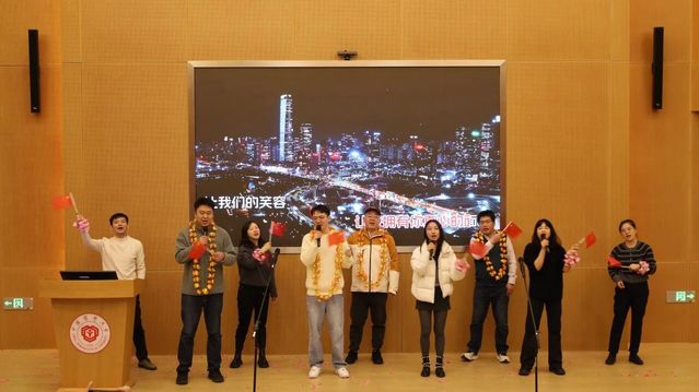 各系、中心准备的节目精彩纷呈。学工团队以活力四射的舞蹈《顺启新年》拉开帷幕,瞬间点燃全场热情;新入职教师代表的《我们都是追梦人》,唱出了青春的理想与担当;工商管理学系教师代表一曲《真心英雄》,以温暖旋律致敬平凡中的不凡;经济贸易系教师代表带来《明天会更好》,寄托对未来的共同期盼;药事管理系教师代表的《后来》,以经典旋律唤起共鸣,传递坚韧与希望;公共管理系教师代表演绎的《如愿》,动情而真挚,表达了对前辈的致敬与对未来的期待;实验中心与院办合作的互动游戏《团结计量——步步高升》,设计巧妙、趣味十足;最后,学院领导班子合唱《我和我的祖国》,铿锵歌声凝聚人心、鼓舞斗志。